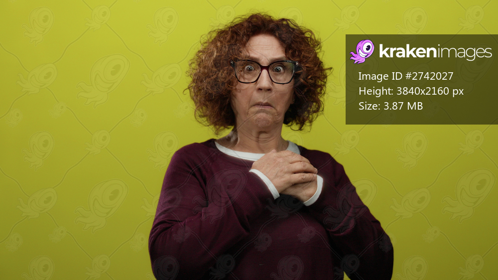 Hispanic middle-aged woman with curly hair wearing glasses looks fearful against a vibrant yellow isolated background, displaying emotion and intensity in her expression. - Kraken Images