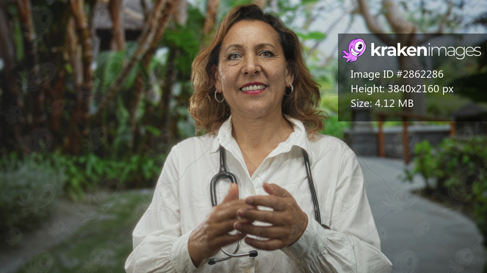 Hispanic middle aged woman doctor with stethoscope claps hands under green canopy in forest; care and gratitude.