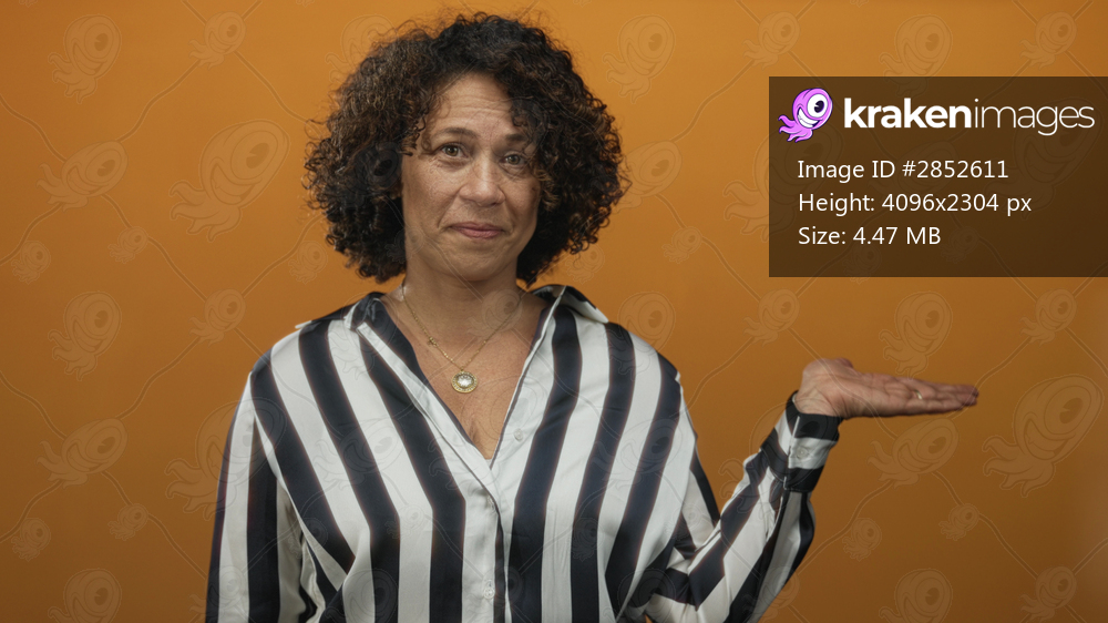 Hispanic middle aged woman facing camera pointing finger to open palm in orange studio; decision confidence.