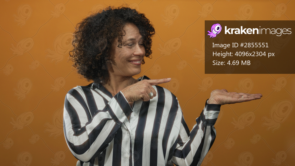 Hispanic middle aged woman facing camera pointing finger to open palm in orange studio; decision confidence.