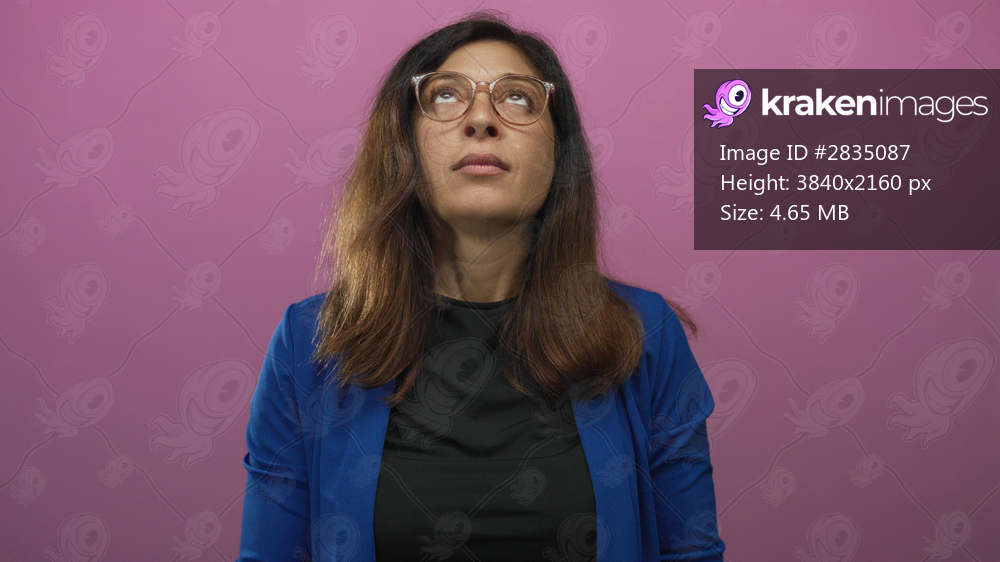 Hispanic middle aged woman with glasses and hands ok sign in pink studio; calm daily meditation practice.