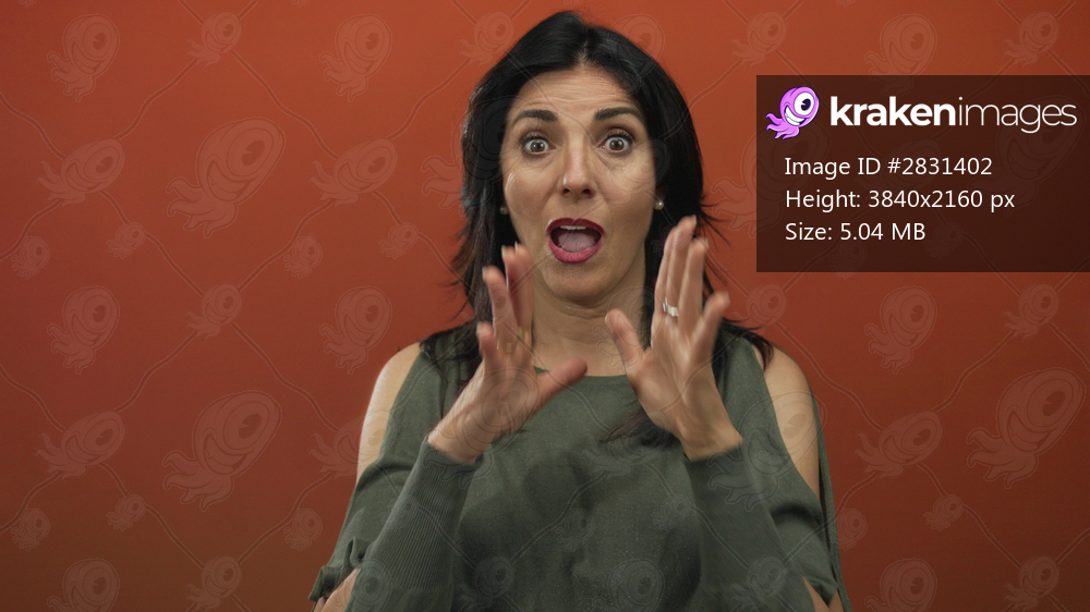 Hispanic middle aged woman with hands pressed against cheeks and wide open mouth in studio; surprise.