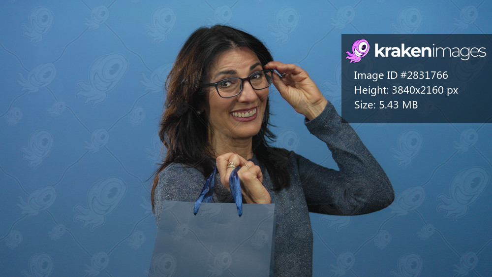 Hispanic middle aged woman holds a blue shopping bag with both hands while smiling warmly in studio; joy.