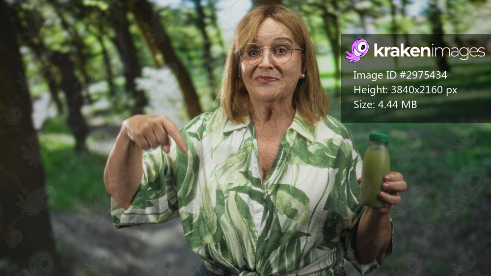 Hispanic middle aged woman holds a green juice bottle and points finger at it in a forest park path with trees and sunlight; health promotion confidence. - Kraken Images