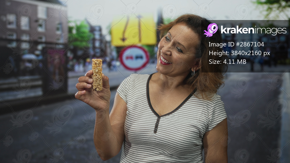 Hispanic middle aged woman holds granola bar in right hand on urban street with blurred facades; enjoyment.
