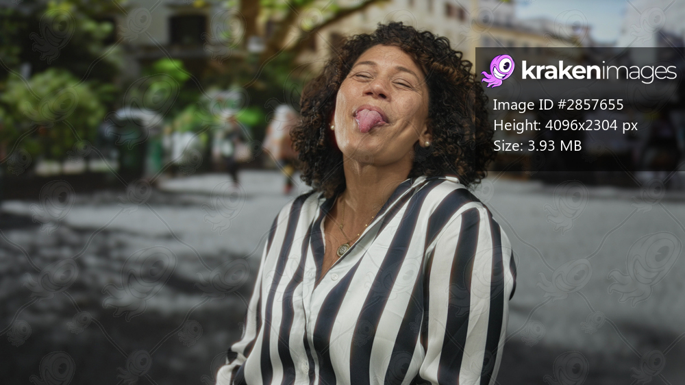 Hispanic middle aged woman in bright striped shirt sticks tongue out on sunlit urban street; playful fun.