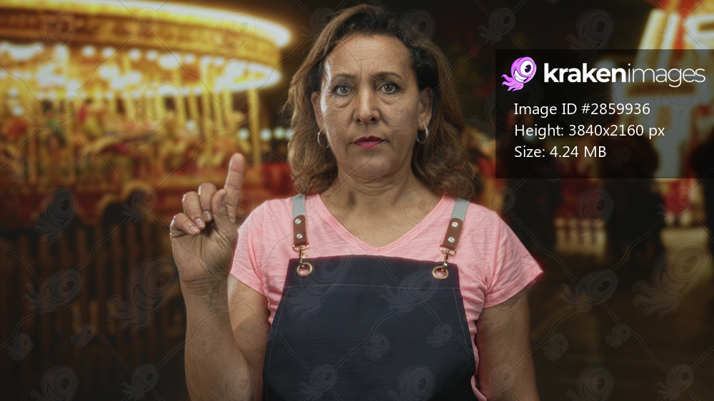 Hispanic middle aged woman in pink shirt and denim overalls points finger upward in street fair at night; determination.