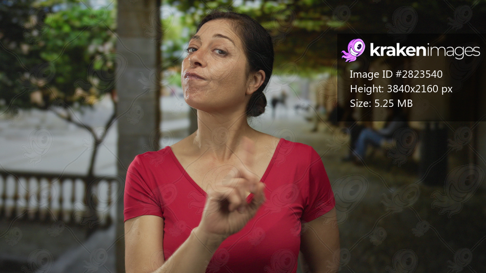Hispanic middle aged woman in red shirt points finger to side on street lined with benches; defiance.