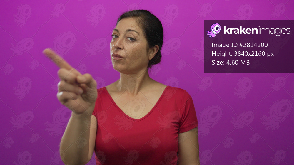 Hispanic middle aged woman in red top makes a no sign by pointing finger forward in studio; denial refusal.
