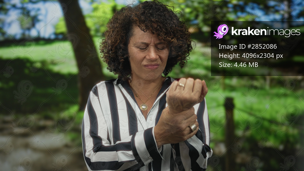 Hispanic middle aged woman in striped shirt grips wrist while grimacing in lush green park with blurred trees; pain injury discomfort.