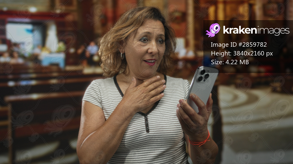 Hispanic middle aged woman in striped shirt holds smartphone with hand on cheek gesture in building; surprise.