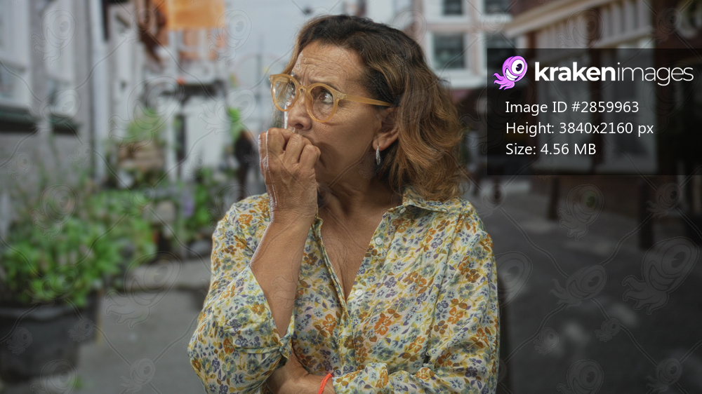 Hispanic middle aged woman in yellow framed glasses biting her fingernails with crossed arms on a narrow street; anxiety.