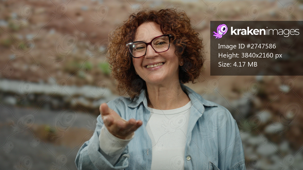 Hispanic middle-aged woman outdoors in urban street extending hand with a friendly smile, wearing glasses and casual clothing, inviting interaction in a cityscape setting. - Kraken Images