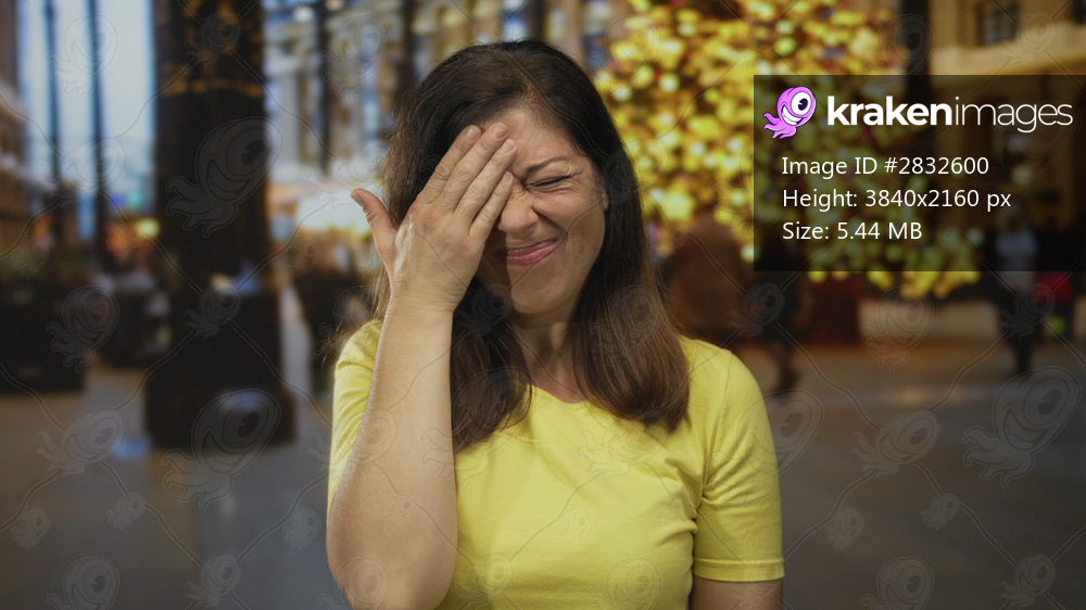 Hispanic middle aged woman places hand to forehead with a slight smile on street illuminated by decorative lights; embarrassment.