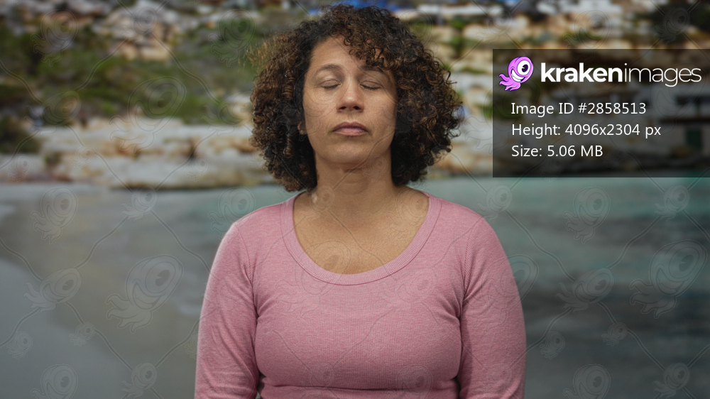 Hispanic middle aged woman points finger to temple near a rocky seaside building by the beach; thoughtful thinking idea.
