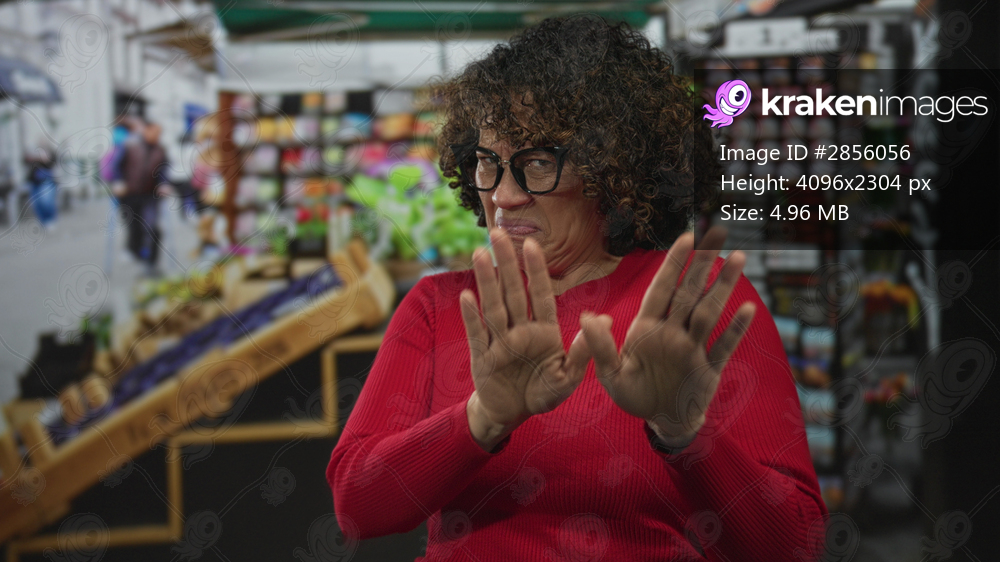 Hispanic middle aged woman pushes palms forward amid bustling street flower market stalls; refusal disgust.