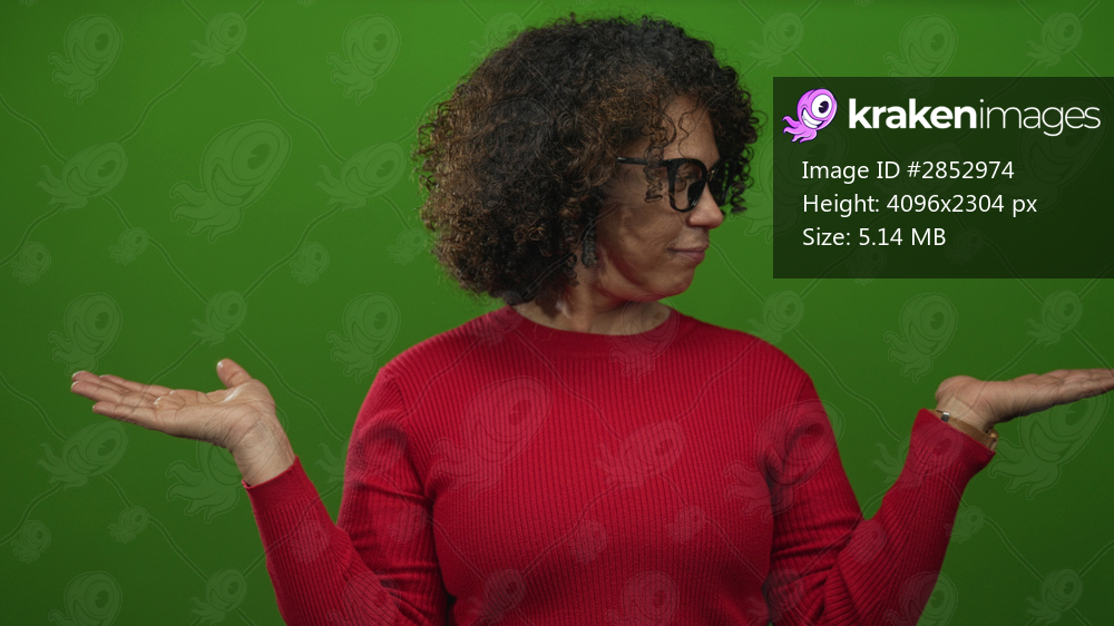 Hispanic middle aged woman wearing glasses and red sweater holds palms up gesture in studio with a hesitant expression; uncertainty.