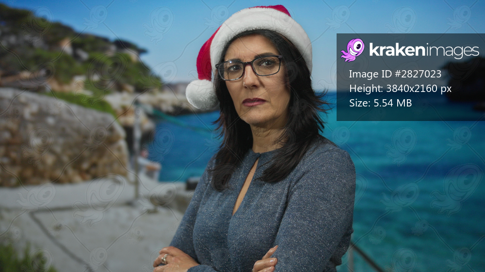 Hispanic middle aged woman wearing red santa hat and crossed arms stands on beach shore by azure sea; rejection solitude.