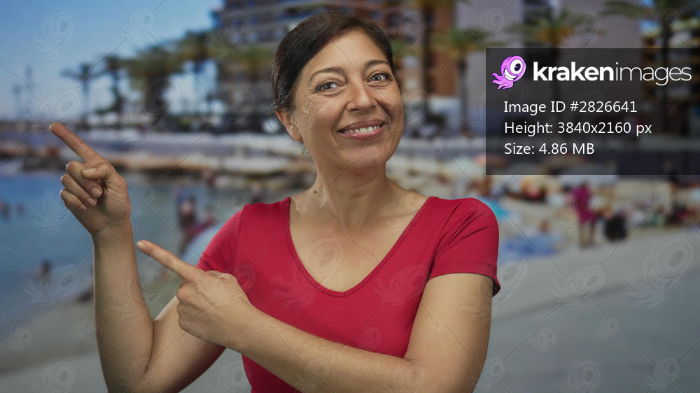 Hispanic middleage woman pointing finger at building beside crowded beach promenade, smiling with raised eyebrows at shoreline; curiosity.