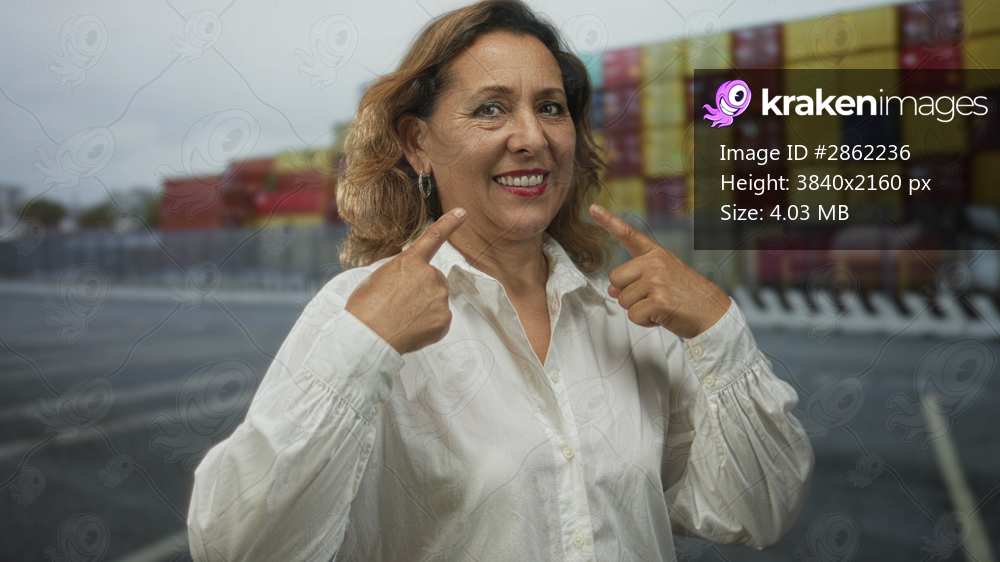 Hispanic middleaged woman points finger to cheeks at port shipping containers; happiness hope courage.