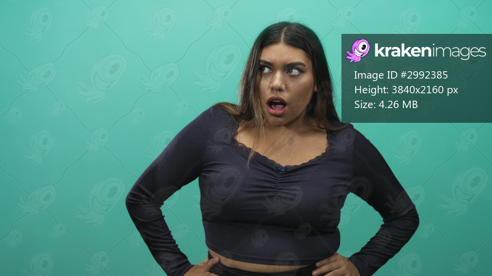Hispanic plus size woman with hands on hips and open mouth, palms shrugging, facing teal studio wall; confusion doubt.