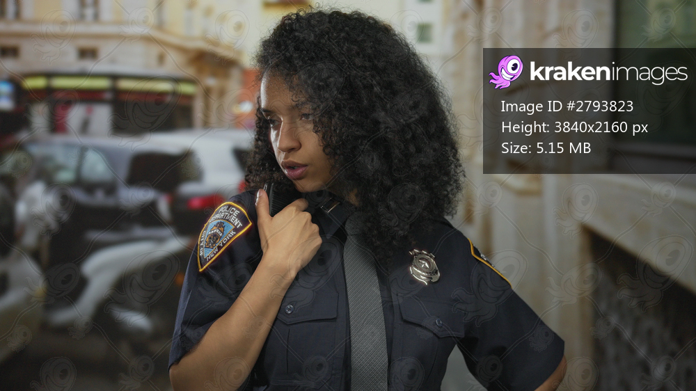 Hispanic police officer with curly hair grips radio mic on city street patrol with visible badge; duty vigilance.