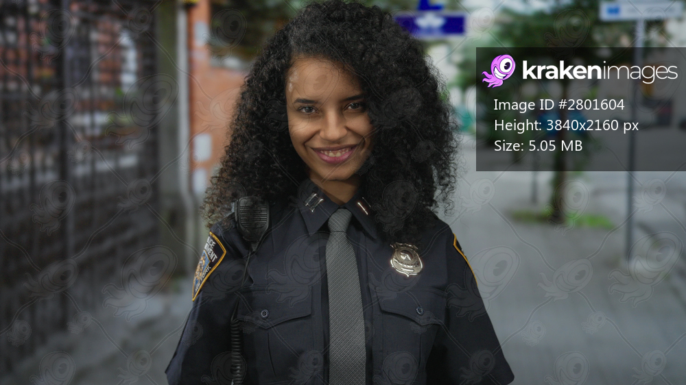 Hispanic policewoman blowing kiss outdoors in uniform on city street with vibrant urban background showcasing confidence and professionalism