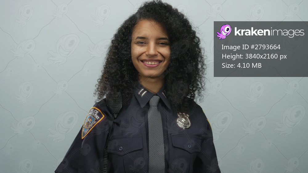 Hispanic policewoman in uniform extends a handshake, smiling confidently against a white background.