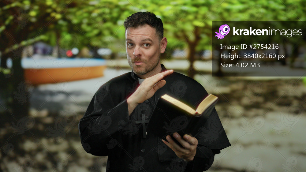 Hispanic priest reading bible outdoors in a sunny park, wearing black robe and cross, surrounded by trees.