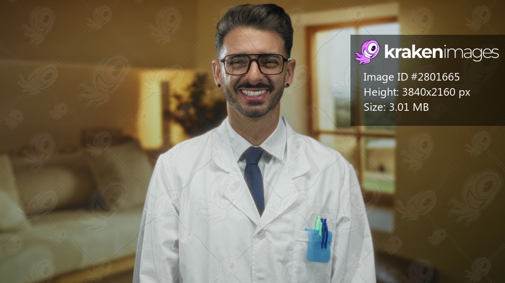 Hispanic scientist man wearing glasses and lab coat smiling by window in cozy living room with sofa and plant; optimism.