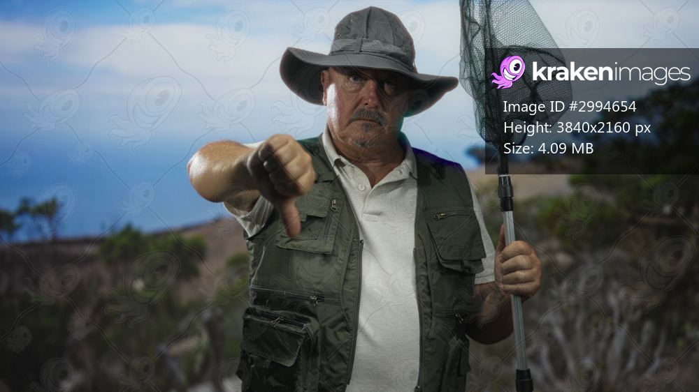 Hispanic senior fisherman wearing widebrim hat and olive fishing vest holds a landing net with one hand and shows thumb down in forest; disapproval.