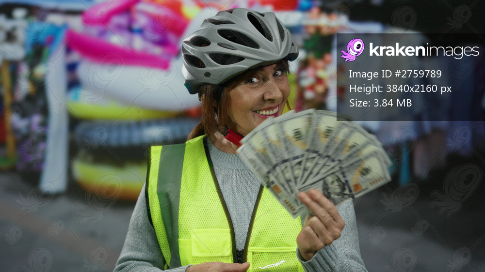 Hispanic senior woman with bike helmet and vest holds american dollars smiling joyfully outside in city shop market setting, surrounded by vibrant colors and bustling environment. - Kraken Images