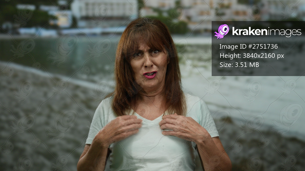Hispanic senior woman expressing surprise stands on a beach with the sea and buildings in the background.