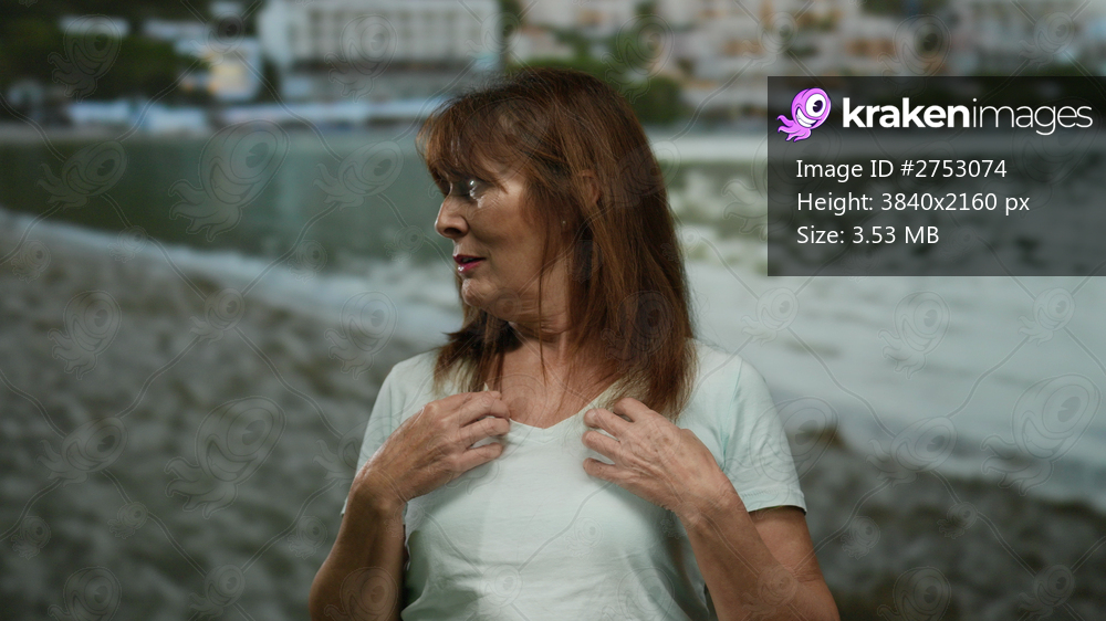 Hispanic senior woman expressing surprise stands on a beach with the sea and buildings in the background.