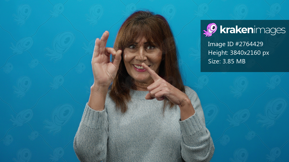 Hispanic senior woman gesturing okay and pointing against an isolated blue wall background with a cheerful expression.