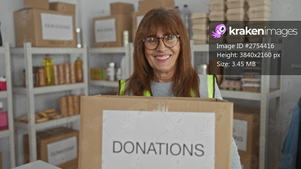 Hispanic senior woman holding donation box in charity center room showcasing community support and giving environment.