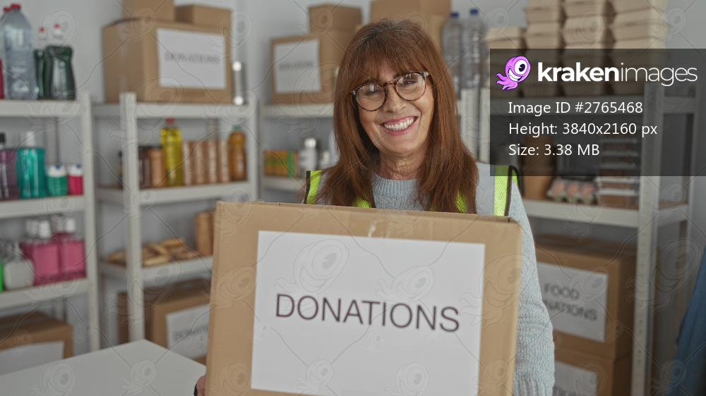 Hispanic senior woman holding donation box in charity center room showcasing community support and giving environment.
