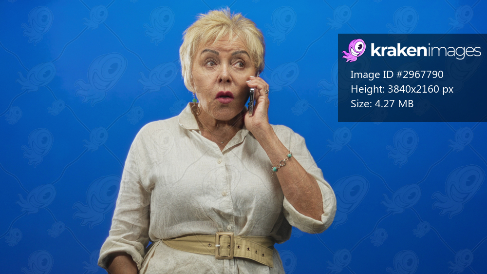 Hispanic senior woman holding smartphone to ear with right hand, eyes wide and mouth slightly open in studio; concern urgency.