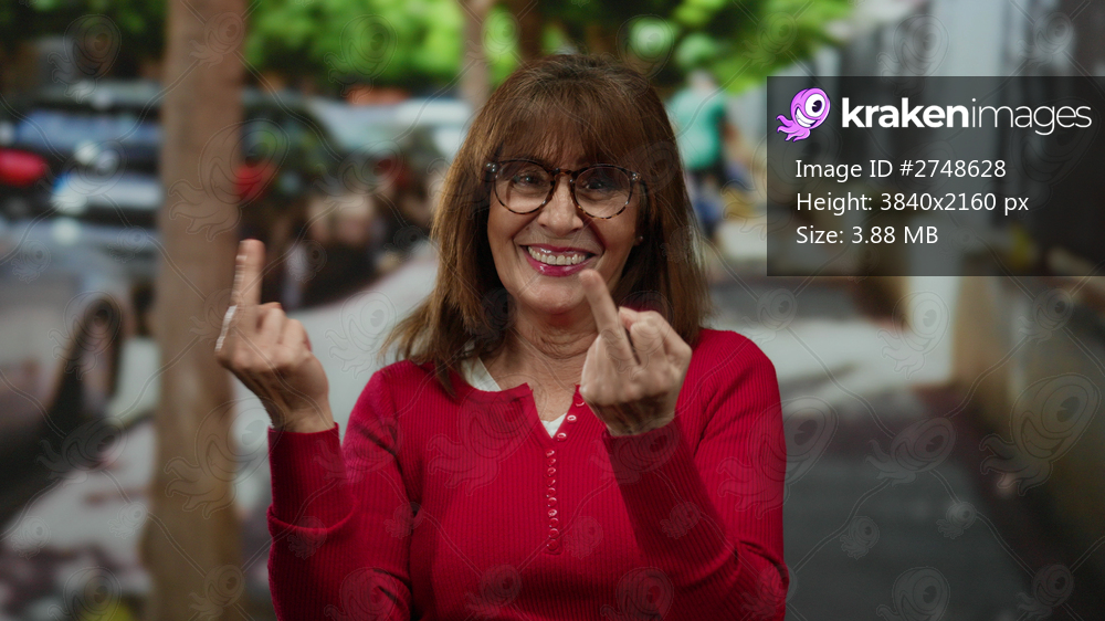 Hispanic senior woman in red sweater making a gesture with middle fingers on a city street background, expressing emotion and attitude outdoors.