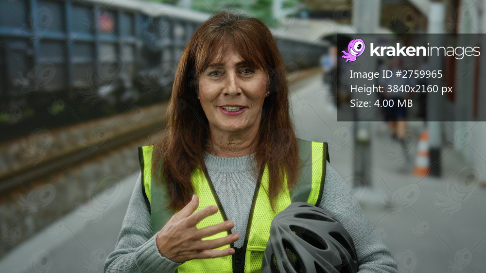 Hispanic senior woman in safety vest holding helmet at train station, conveying a sense of preparedness and safety in an outdoor railway environment with trains in the background. - Kraken Images