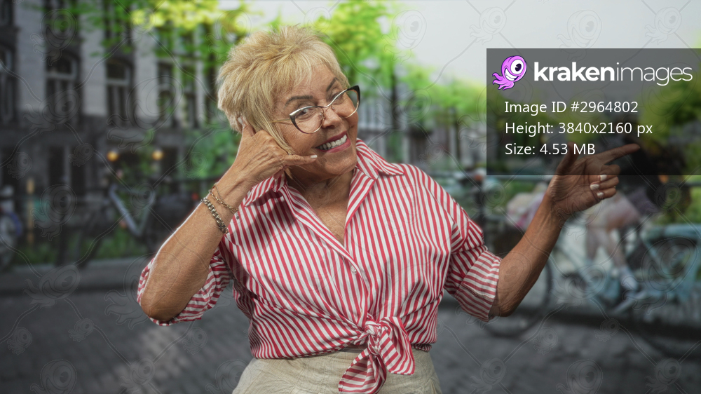 Hispanic senior woman in striped shirt wearing glasses makes phone gesture with hand and points finger on a street; playful.