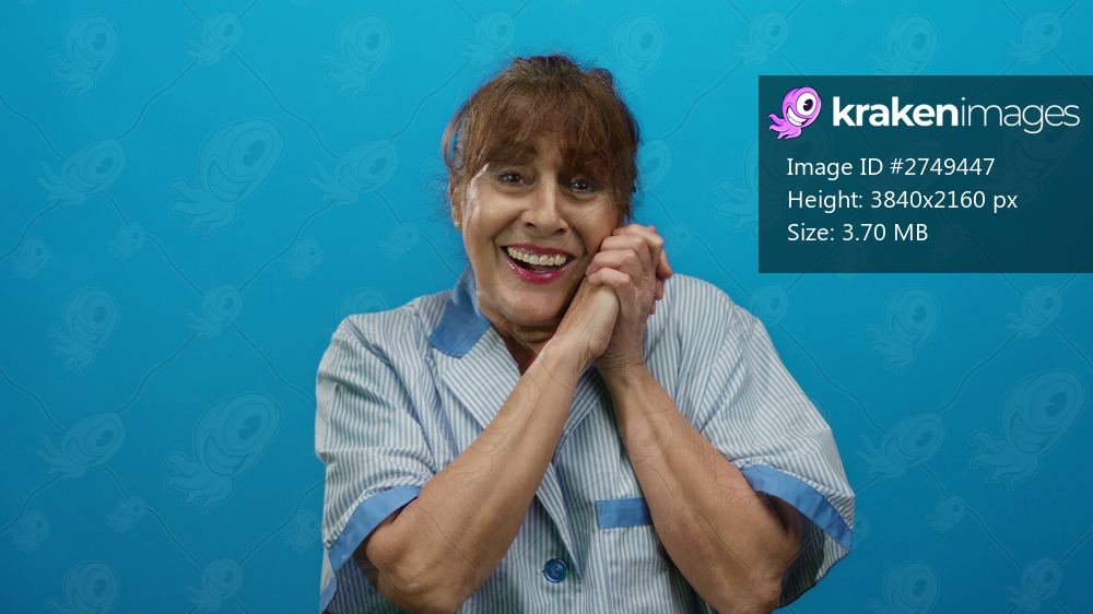Hispanic senior woman in uniform smiling against blue background, expressing happiness and satisfaction in her cleaning job, isolated for a professional portrait. - Kraken Images