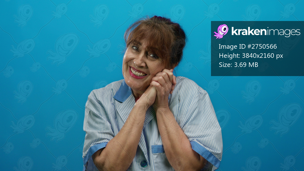 Hispanic senior woman in uniform smiling against blue background, expressing happiness and satisfaction in her cleaning job, isolated for a professional portrait. - Kraken Images