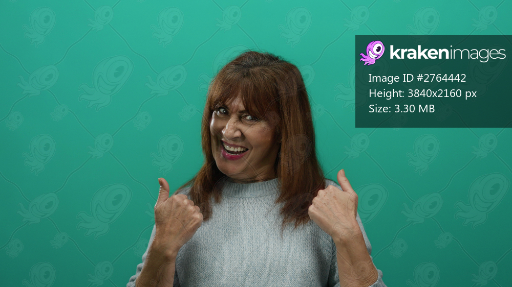 Hispanic senior woman with long hair makes welcoming gestures against an isolated green background, wearing a casual sweater with an inviting expression conveying warmth and friendliness. - Kraken Images