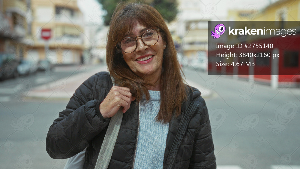 Hispanic senior woman smiling confidently in city street setting, captured outdoors with urban background, light sweater, glasses, and casual jacket, embodying modern lifestyle element. - Kraken Images