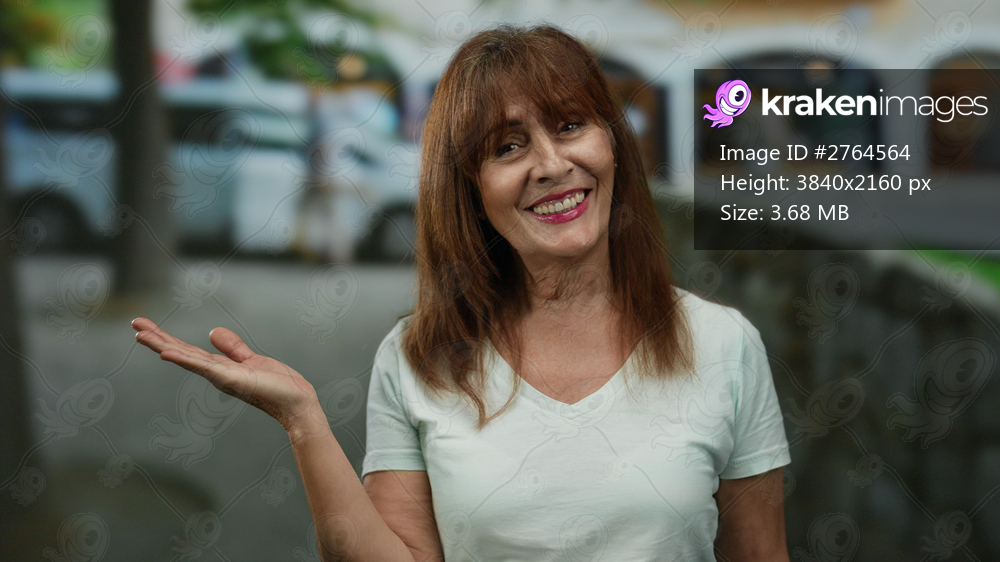 Hispanic senior woman smiling and gesturing on a lively city street with cars in the background represents urban environments and vibrant outdoor activities. - Kraken Images