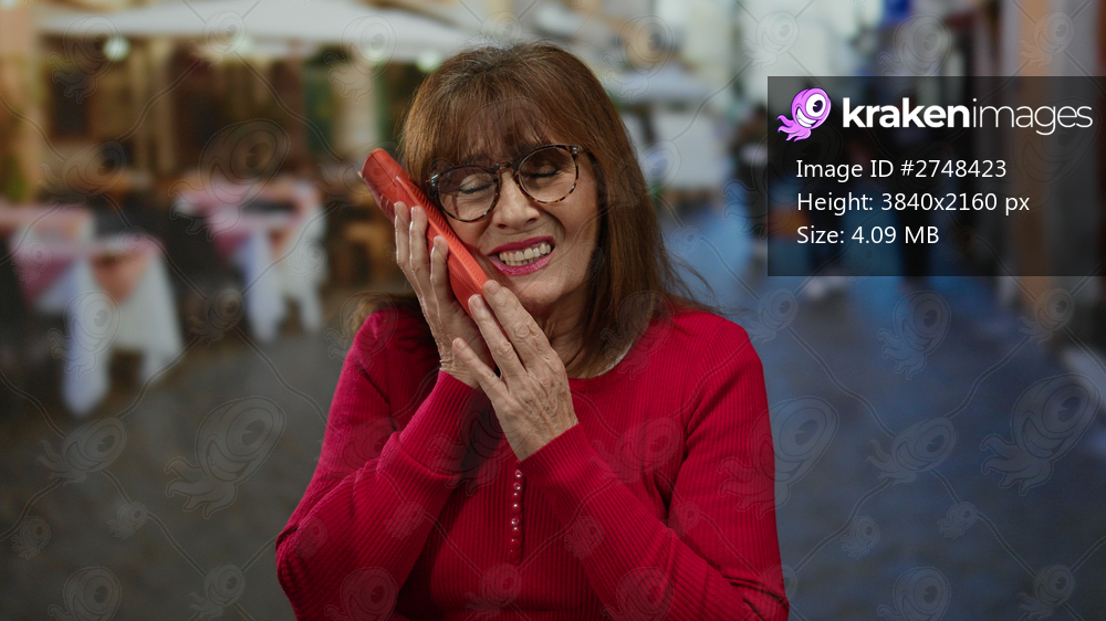 Hispanic senior woman with toothache holds ice pack on cheek while sitting on a city restaurant terrace, wearing glasses and red sweater, surrounded by urban street activity. - Kraken Images