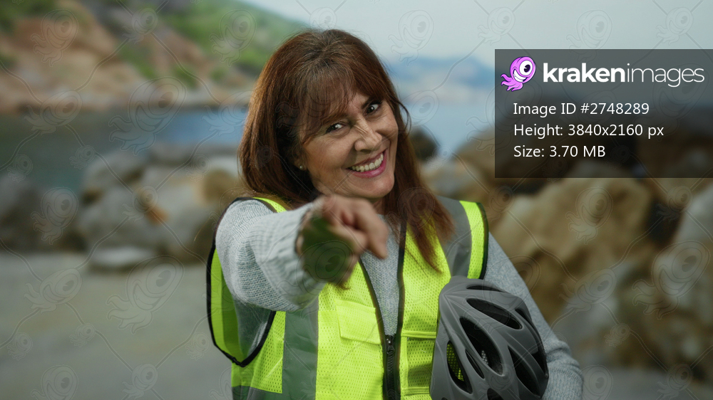 Hispanic senior woman winking and pointing at the camera in a vibrant outdoor setting at the beach, wearing a high visibility vest and holding a bicycle helmet near the seaside cliffs. - Kraken Images