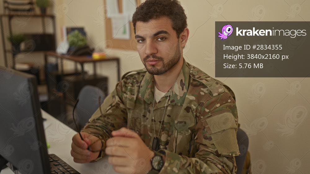 Hispanic soldier in camouflage uniform adjusting his glasses at office computer desk beside a keyboard and monitor; determination resilience focus confidence.
