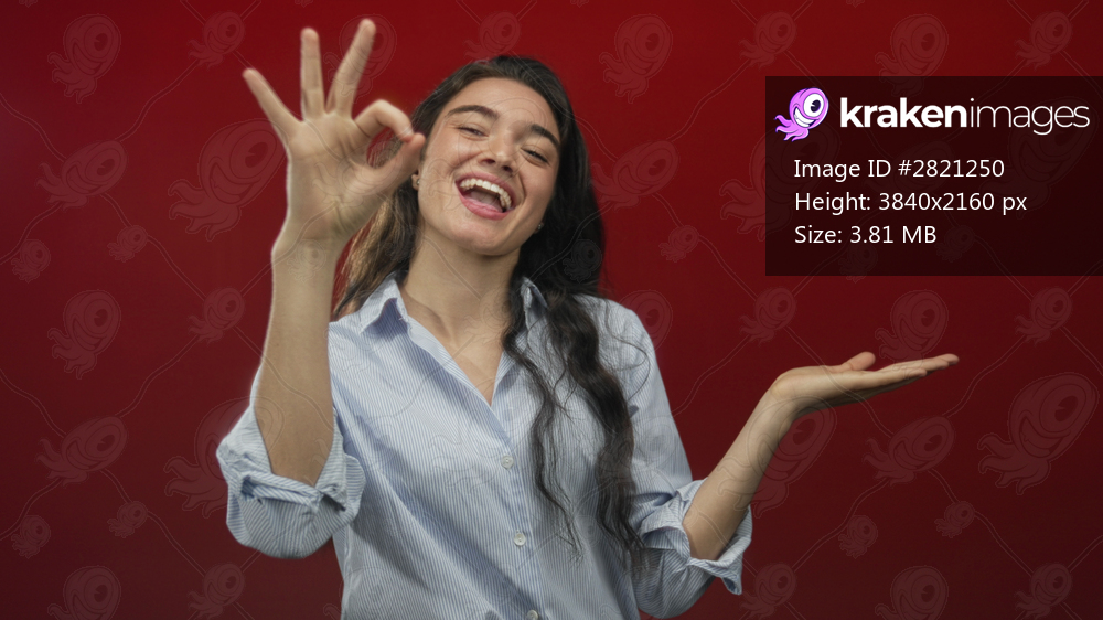 Hispanic teen woman in striped shirt pointing finger to open palm in red studio setting; confidence.